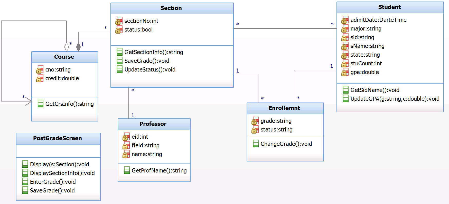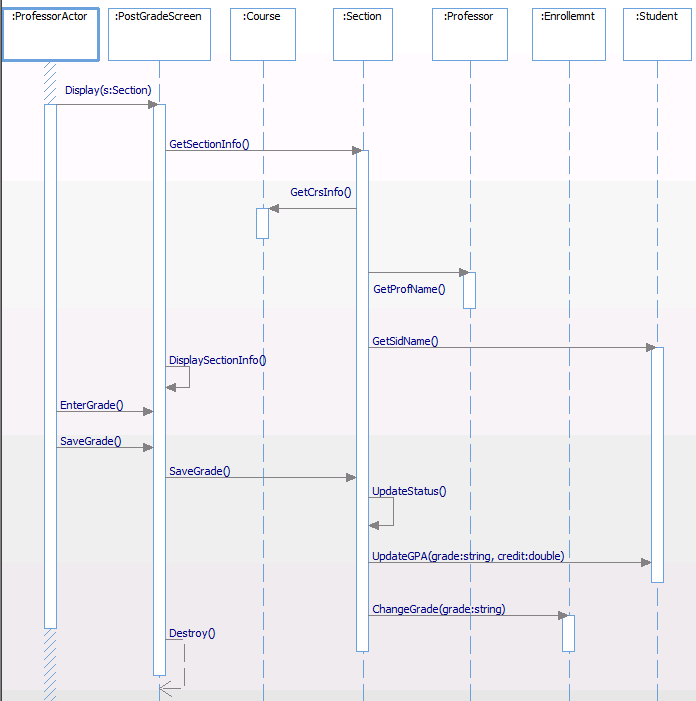 To approach this example in particular and to understand the concept of collaboration in general (e.g., where to house the main operation and where to delegate sub-tasks), we create a class diagram first and try to implement a few key classes such as Section next. It will be apparent that the PostGrade screen should delegate the job of obtaining information to be pre-rendered to Section class. Even Section does not have all the information such names of students ready, Section can delegate the sub tasks to other objects it knows. Similarly, when saving grades, PostGradeScreen should delegate the job to Section, which in turn will delegate sub tasks to Student and Enrollment for updating GPA and grades respectively.