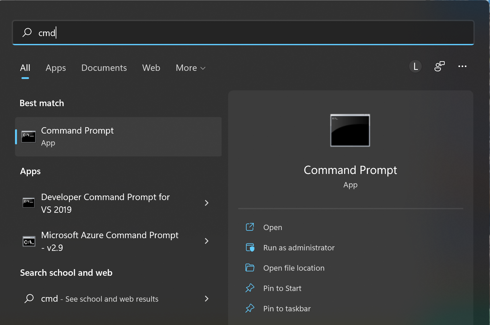- To verify the installation, in the windows search box, type "cmd" and open Command Prompt (see below)